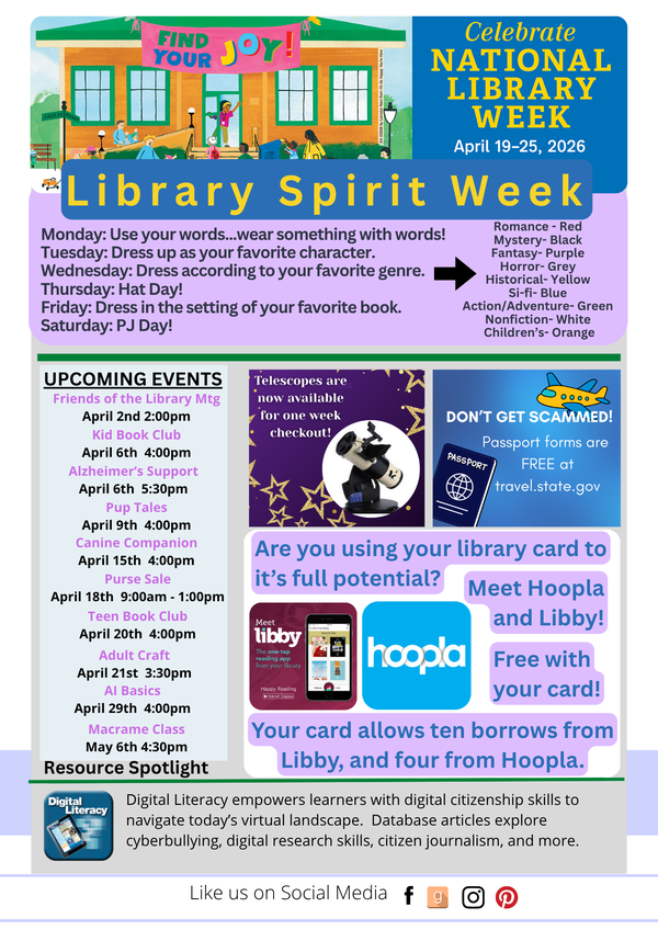 Are you interested in traveling outside the United States? The first step on your adventure should include a passport. Fill out forms for free on travel.state.gov and call the library to set up an appointment. Have you been getting all of the perks out of your library card? The library offers two ebook apps, Libby & Hoopla for online reading. Visit our website for more information on how to login with DSPL.